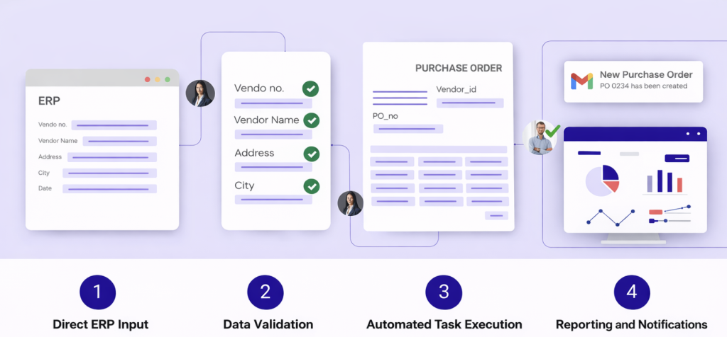 AI agents fit into this environment not as replacements, but as navigators. Their role isn’t to own the process end-to-end in a monolithic way. It’s to understand when something starts, extract what matters, apply business logic, and trigger the right actions across the systems that already exist.